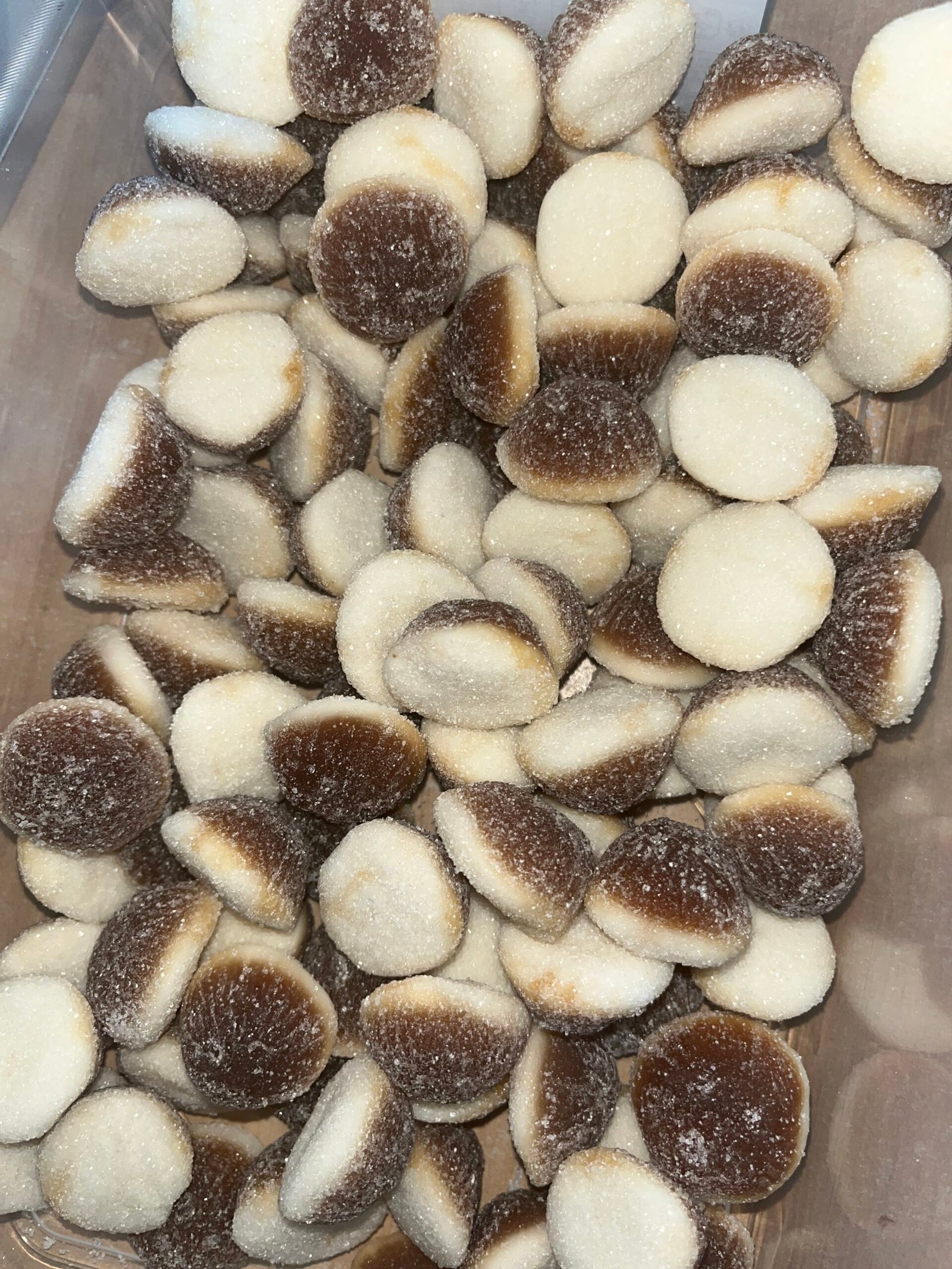 Sirop de glucose, eau, sucre, amidon, gélatine de boeuf, acidifiants : acide citrique, acide malique, arômes, régulateur d’acidité : citrate de sodium, colorant E129.