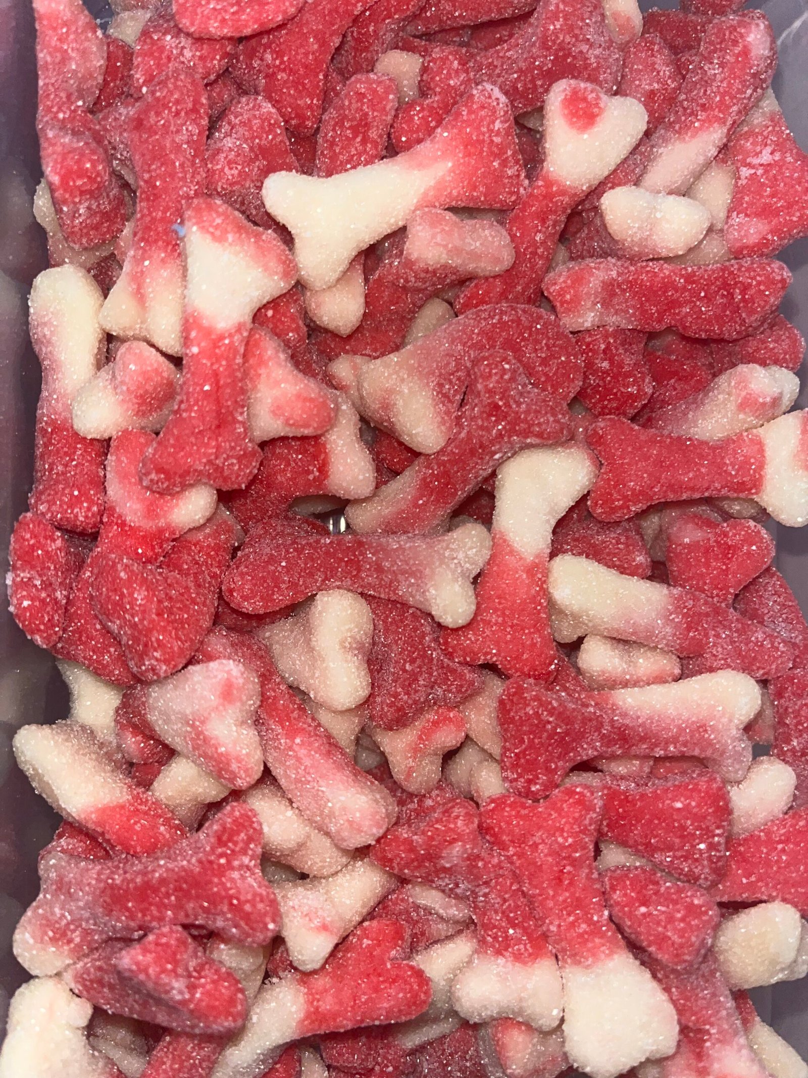 Sirop de glucose, sucre, eau, gélatine de boeuf, amidon modifié de pomme de terre, acidifiants : E330, E270, E296, arômes, agent d’enrobage : cire de carnauba, colorants : E163, E129, E160a. Sans Gluten.